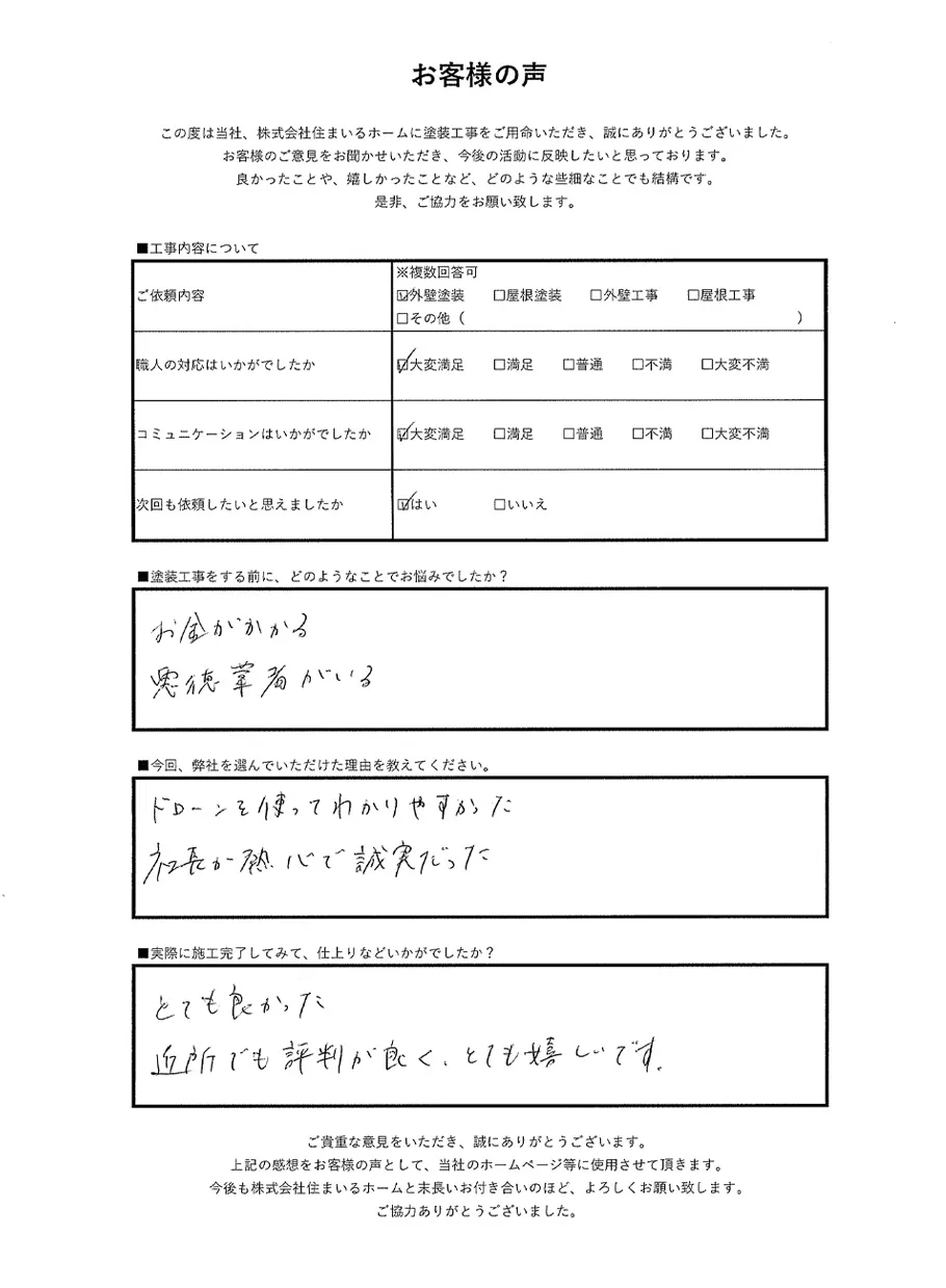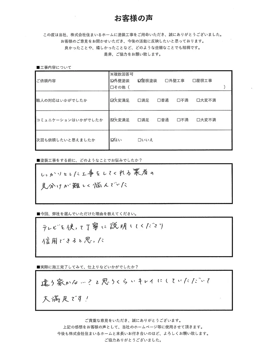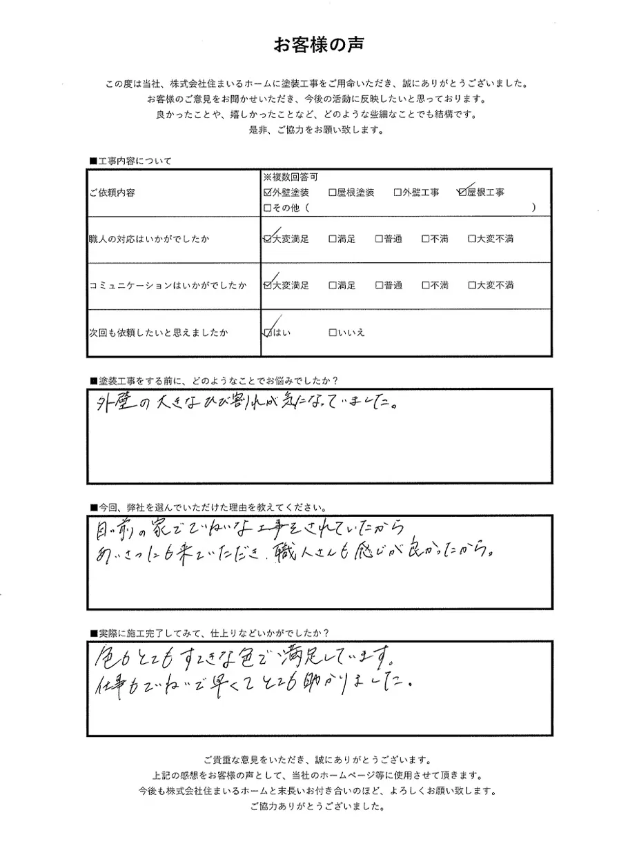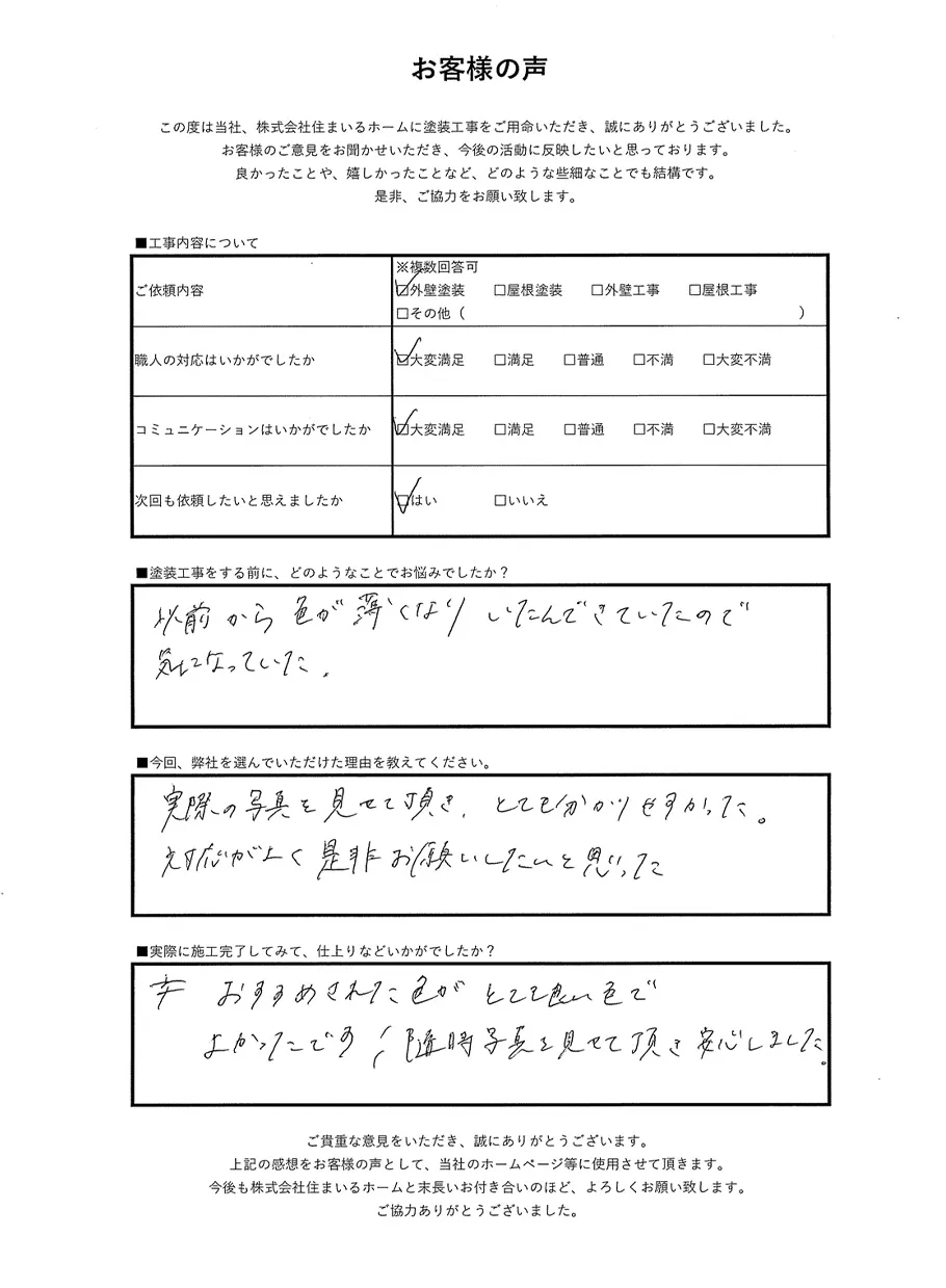 お客様が今まで大切にしてこられたお家、そしてこれからも大切に住み続けられるお家のメンテナンスに関われることを心から嬉しく思い、施工させていただいております。